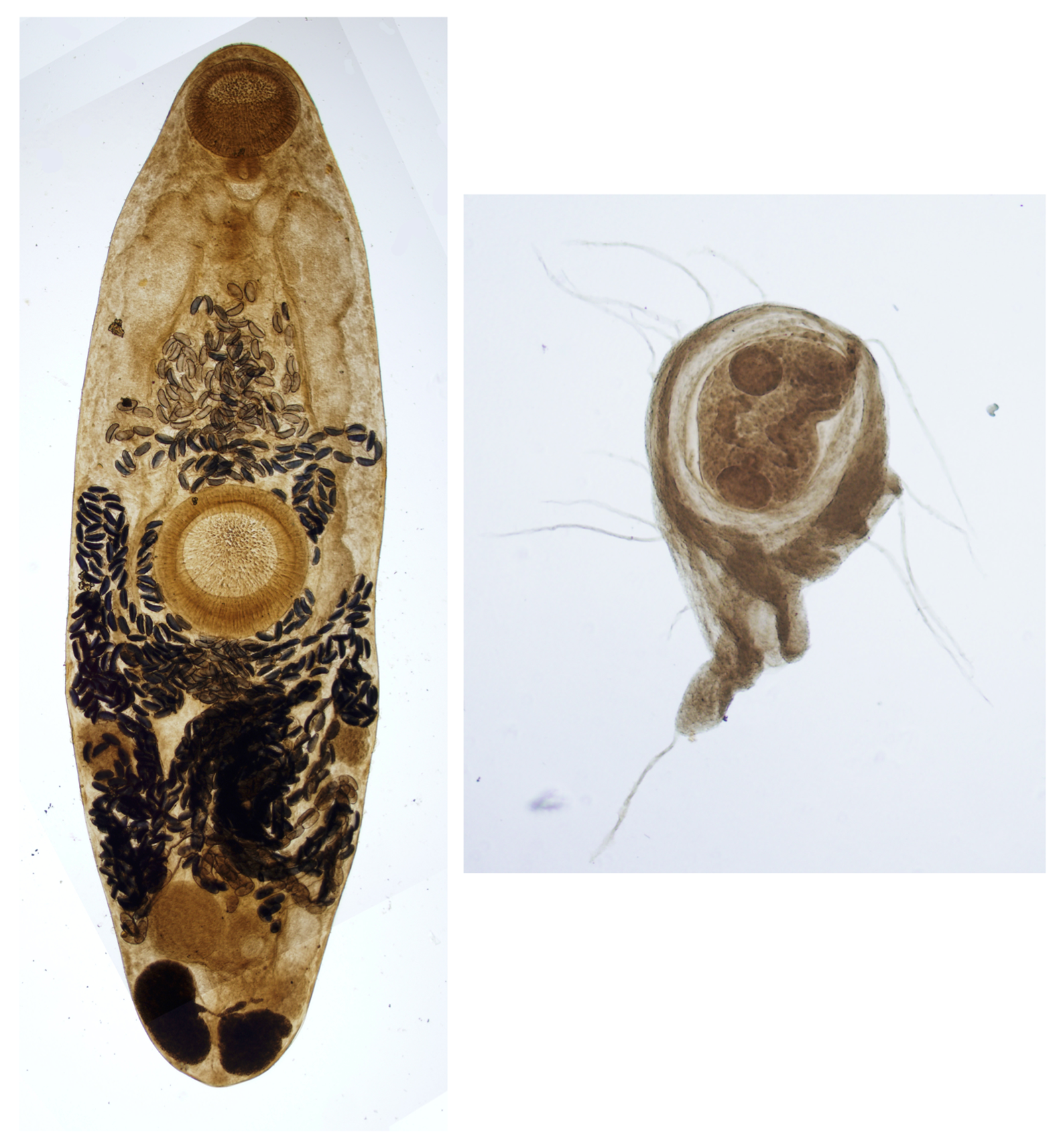寄生虫の写真です。左はヤリタナゴ吸虫Allogenarchopsis problematicaの成虫で,右はそのセルカリア幼生(Cercaria problematica)です。