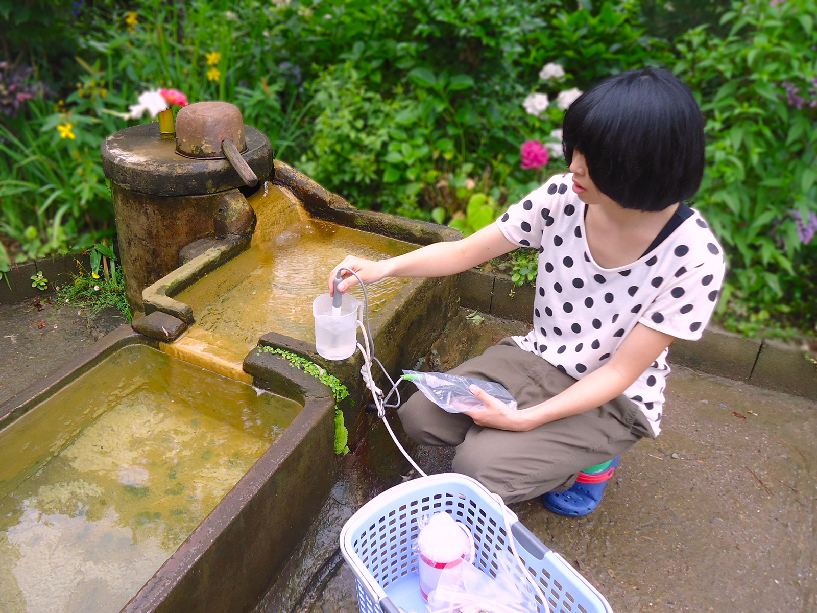 琵琶湖沿岸の集落に自噴する湧水の水質(電気伝導度)を測定しているようす。