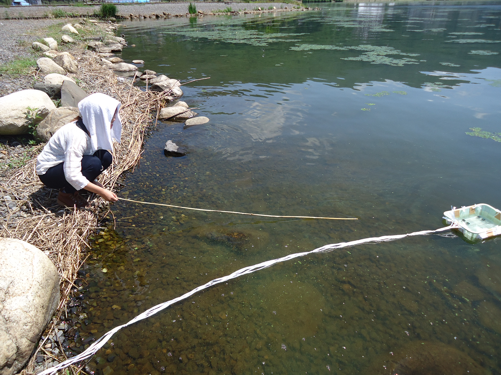 富栄養化で有名だった「諏訪湖」です。その場で濾過した水を石英瓶に詰め,光照射して有機物が紫外線でどのくらい分解されるかを実験している様子です。