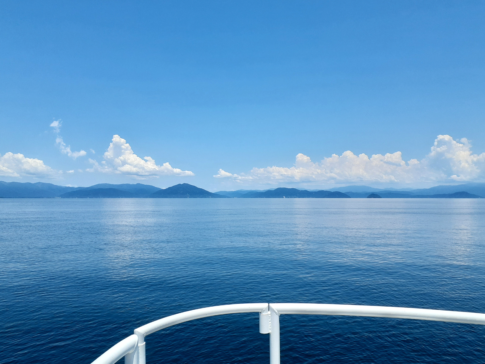 琵琶湖(高島市沖)から海津大崎(中央左),葛籠尾崎と竹生島(中央右)をのぞむ。