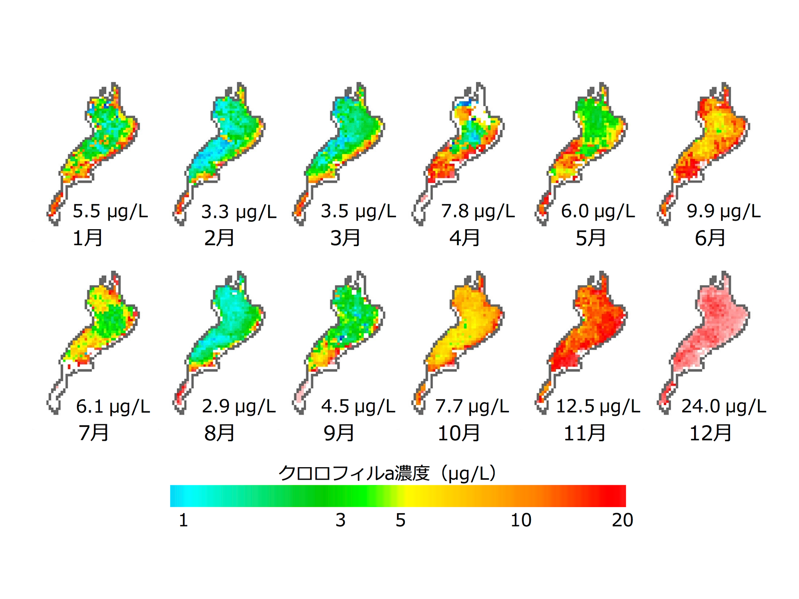 琵琶湖全域におけるクロロフィルa濃度分布の季節変化を示した図です。琵琶湖の植物プランクトン現存量が季節的に大きく変動している様子がわかります。