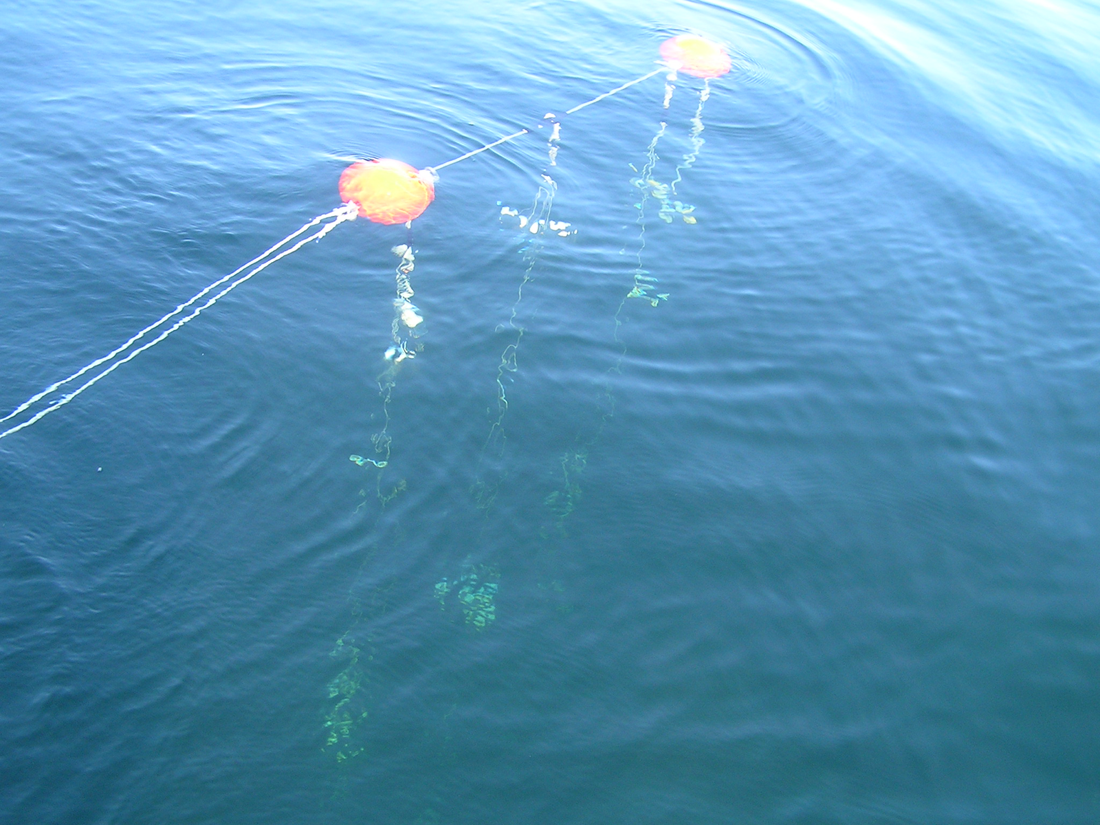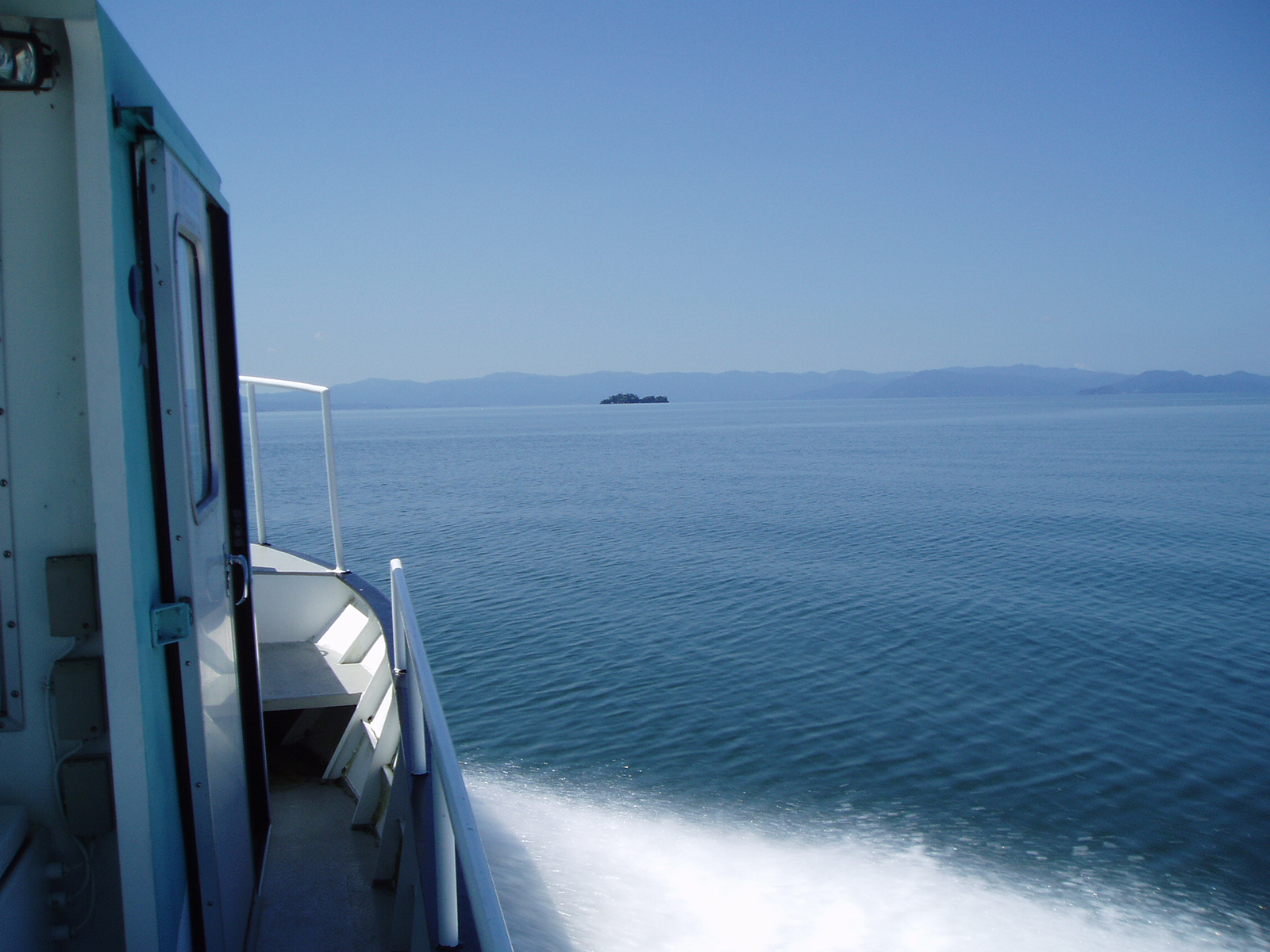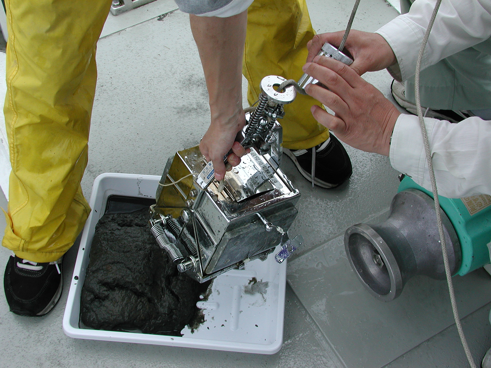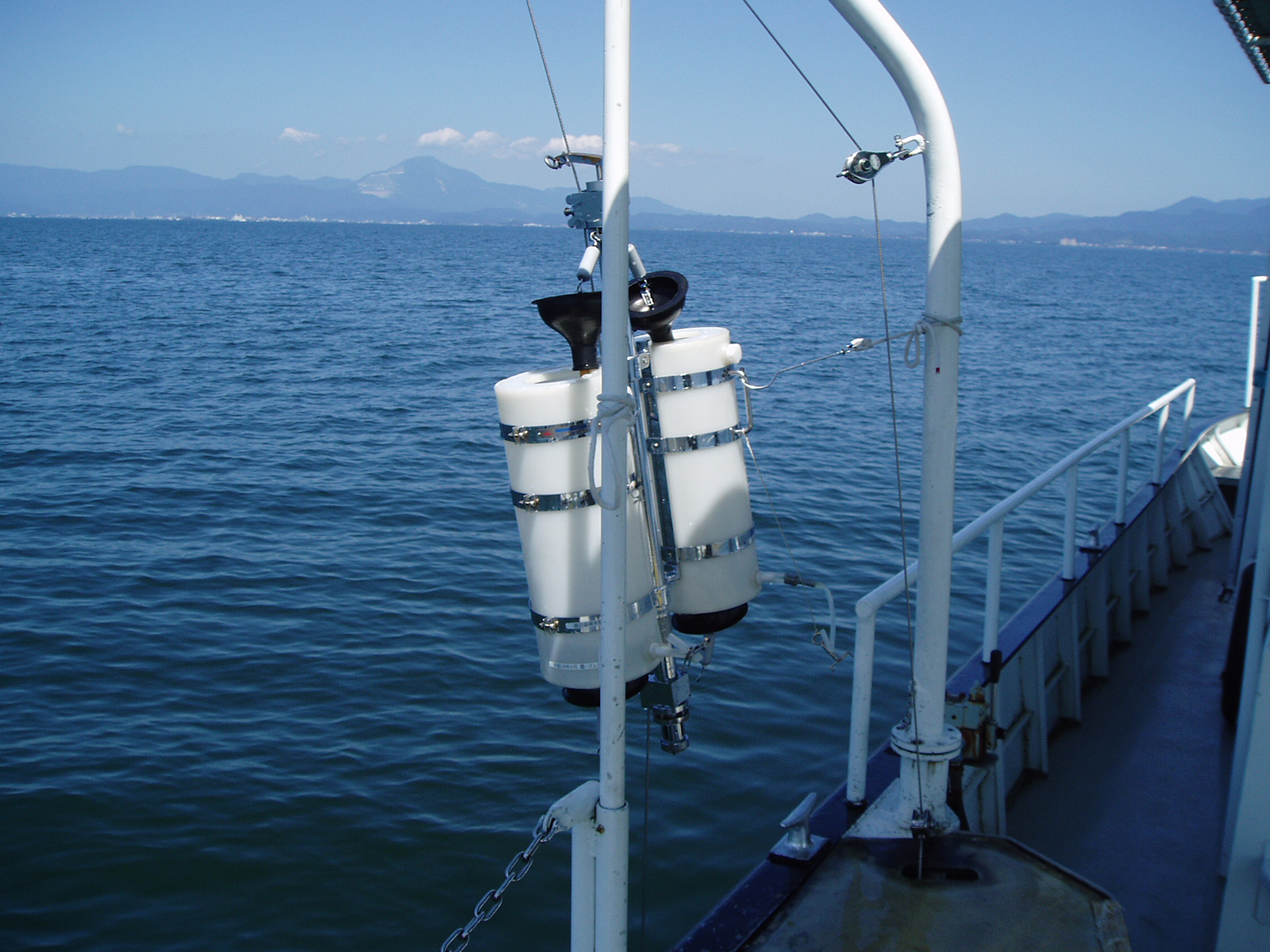 実習調査船「はっさか」で琵琶湖北湖を調査する様子です。係留実験系を設置して植物プランクトンの光合成速度を測定したり,バンドーン採水器で湖水を採水したり,湖底堆積物を採取したりといった様々な調査・観測を行います。