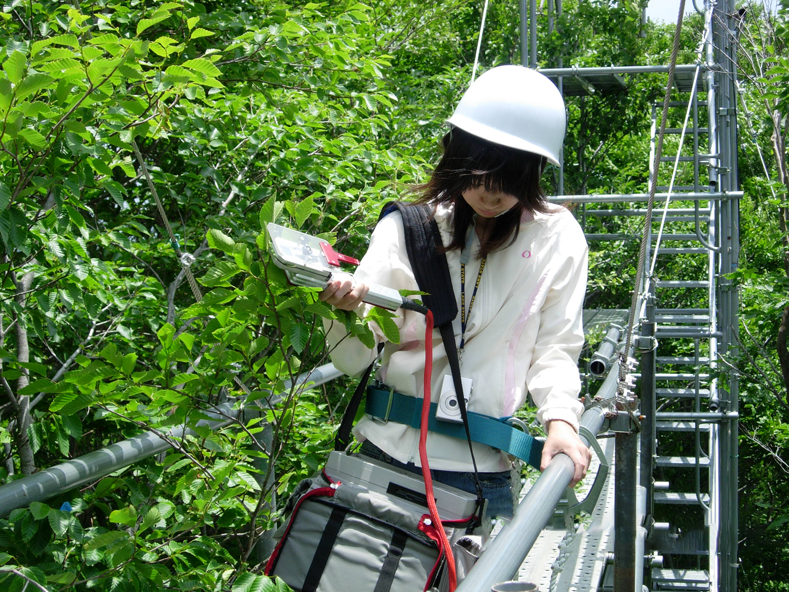 足場を組んで,林冠部で樹木の葉の光合成を測定します。
